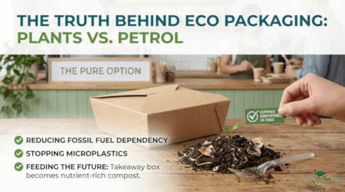 When we choose packaging from companies like us (The Pure Option), we are participating in a circular economy. Unlike traditional plastics, which are derived from "dead dinosaurs" (fossil fuels) and can linger in our oceans and landfills for centuries, plant-based packaging is made from renewable resources like sugarcane bagasse, corn starch, and wood pulp.