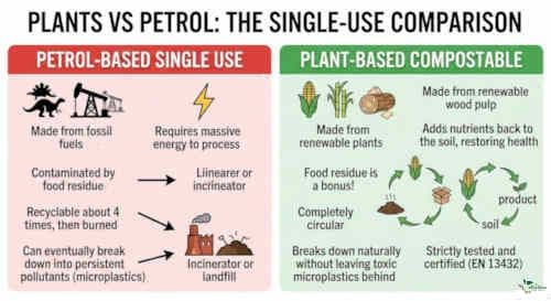 Traditional plastics are made from "dead dinosaurs" (fossil fuels). Plant-based packaging—made from corn starch, sugarcane, or wood pulp—uses renewable resources that help the planet "breathe" as they grow.